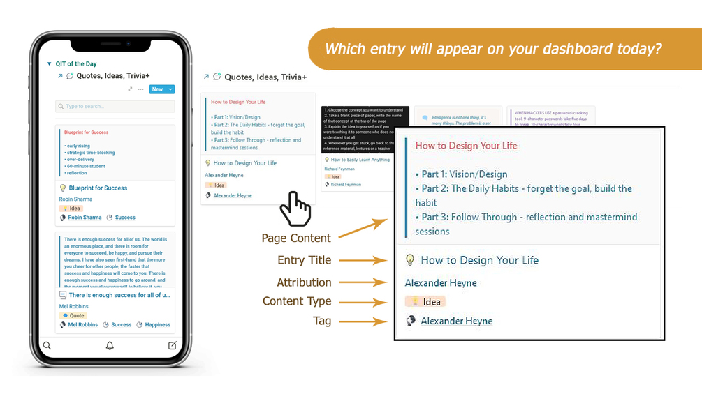 Right out of the package, the QIT+ template is equipped to handle three types of collections: quotes, ideas, and trivia. But why stop at three? Any knowledge base grows, and this template can, too. It’s equipped with an expansion guide that explains, with screenshots, how to create the elements you need to add the types of nuggets and tags that are relevant to you.