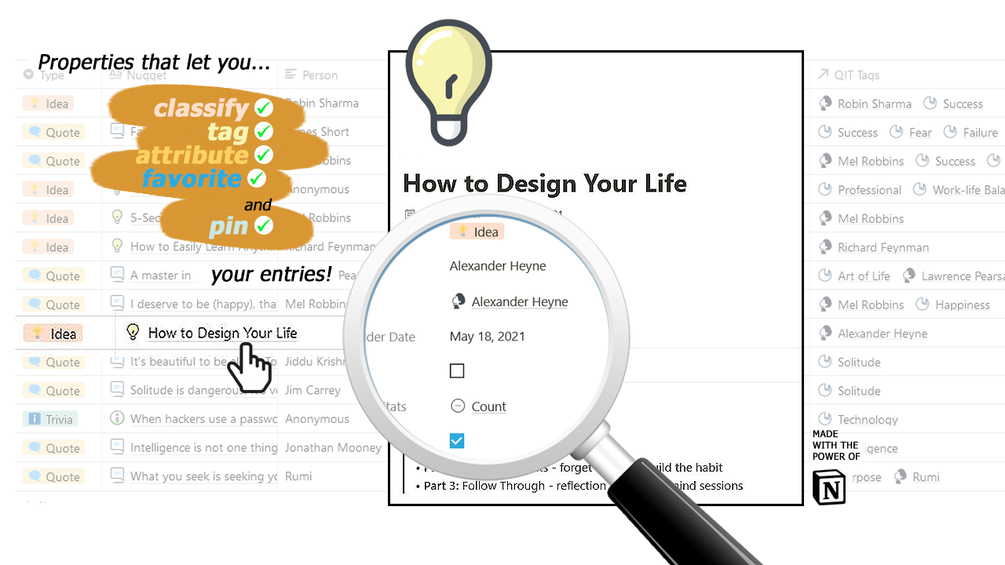 There is a collector in each of us and there’s gotta be a solution for the friction that comes with collecting quotes, ideas, trivia, etc., in this information-loaded century. And we all know that, no matter what, collector’s gonna collect — so all these quality-of-life features are included in one robust template complete with a full set-up guide with pictures and — just an extra something — a list of customization tips.